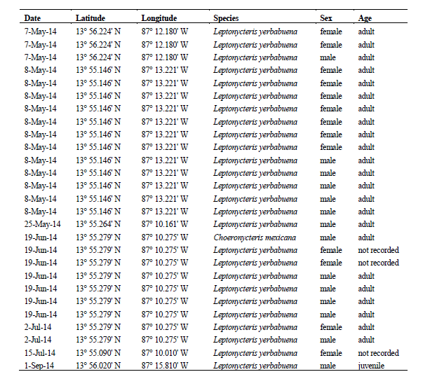 Mora, J. M., M. R. Espinal, & L. I. López. 2020. New records on distribution and habitat of the lesser long-nosed bat (Leptonycteris yerbabuenae) in Honduras. Neotropical Biology and Conservation 15:521-531. https://doi.org/10.3897/neotropical.15.e57376