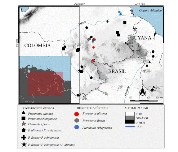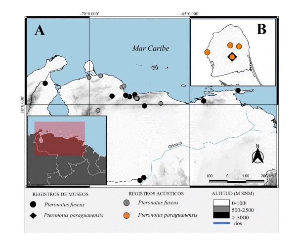 Abstract: The information available on the geographical distribution of bats of Pteronotus .Phyllodia) (Chiroptera: Mormoopidae) in Venezuela is updated, as a result of the taxonomic analysis of museum specimens and the diagnosis of acoustic records. Prior to this work, three species of the subgenus were known in the Venezuelan territory: Pteronotus .Phyllodia. paraguanensis, endemic to the Paraguaná Peninsula; P. .Phyllodia. fuscus, with a wide distribution that covers the northern region (except Paraguaná), as well as the northern portion of the Amazon and the Guiana Shield; and P. .Phyllodia. rubiginosus, restricted to the south of the Orinoco River. A fourth species, P. .Phyllodia. alitonus, is included in the country for the first time, based on records obtained in the states of Amazonas and Bolívar. The morphological characters that allow identification of the species of Pteronotus .Phyllodia) that occur in Venezuela, as well as their echolocation patterns, are presented. The discovery of P. .P.. alitonus increases the number of known mammals in Venezuela to 405 (173 belonging to Chiroptera) and extends the distribution range of the species approximately 700 km northwest of the closest previously reported locality.