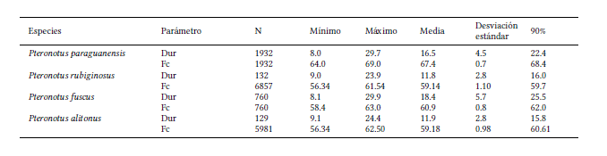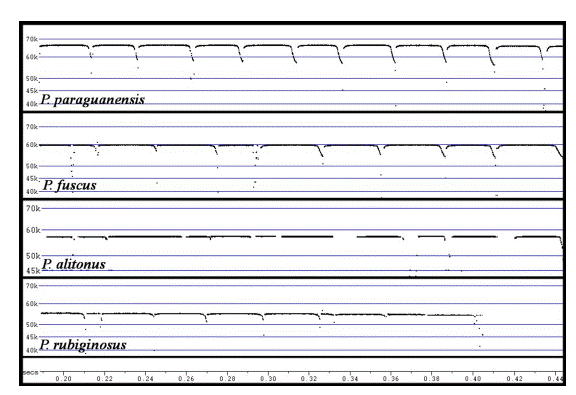 La Fig. 5 muestra las señales vocales acústicas de diagnóstico para los cuatro miembros de Phyllodia conocidos en Venezuela. En la Tabla 4 son señalados los rangos encontrados para la duración del pulso (Dur) y la frecuencia característica del armónico dominante, así como los valores obtenidos para ambos parámetros con el 90% de las llamadas analizadas. Pteronotus (Phyllodia) paraguanensis posee la Fc más alta, con variaciones entre 65 y 67 kHz; estos niveles de frecuencia están relacionados con su menor tamaño entre las especies del subgénero. Pteronotus (Phyllodia) fuscus tiene una Fc entre 60 y 62 kHz, mientras que en P. (Phyllodia) alitonus dicho parámetro presenta valores intermedios (57-59 kHz). Las señales vocales de P. rubiginosus evidencian las Fc más bajas registradas para los representantes de Phyllodia señalados en territorio venezolano, con un rango de 54 a 56 kHz.
