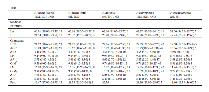 En la Tabla 1 se incluyen las medidas corporales y craneanas obtenidas para cada una de las especies evaluadas. Pteronotus (Phyllodia) paraguanensis es la especie de menor tamaño, seguida por P. (Phyllodia) fuscus (incluye las poblaciones del norte y del sur), mientras que P. (Phyllodia) alitonus y P. (Phyllodia) rubiginosus muestran las mayores dimensiones.