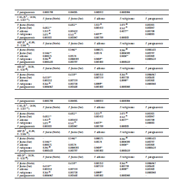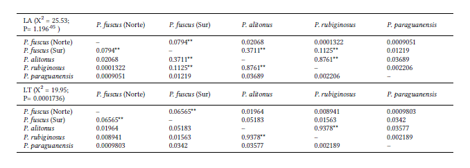 Los resultados de la prueba estadística para las dos variables externas analizadas (longitud del antebrazo y longitud de la tibia) son presentados en la Tabla 2. Se encontraron diferencias estadísticamente significativas al comparar los valores de ambas medidas entre la mayoría de las especies, con la excepción de P. (Phyllodia) alitonus y P. (Phyllodia) rubiginosus, que no pudieron ser discriminadas por sus dimensiones externas. Asimismo, los individuos pertenecientes a las poblaciones de P. (Phyllodia) fuscus del norte y del sur, tampoco mostraron variaciones significativas en las longitudes de antebrazo y tibia.