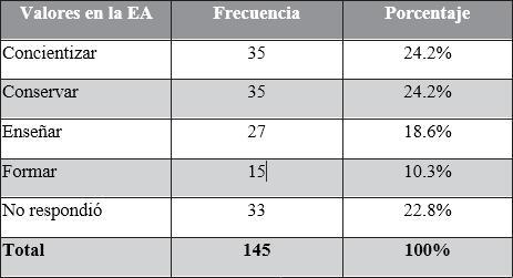 Un resultado más, expuso que 37% de ellos no saben qué materias de tipo ambiental pueden incluirse en un plan de estudios de una licenciatura en la que se forman especialistas en educación y que en cuanto escalas de valores para su actuar en la EA, 22.8% no distingue lo que es un valor y mucho menos cómo estos valores se relacionan con temas ambientales.