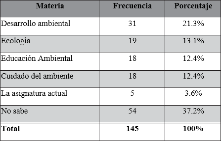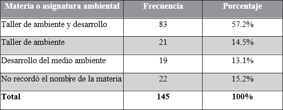 En el siguiente bloque del cuestionario se buscó conocer la formación para el saber ambiental como parte de su profesionalización; por esta razón, se les preguntó si recordaban haber cursado asignaturas de educación ambiental en su trayectoria escolar; 57.2% mencionó una materia de taller de ambiente y desarrollo, 14.5% un taller de ambiente, 13.1% una asignatura de desarrollo del medio ambiente, y 15.2% no recordó el nombre (véase tabla 3). Estos resultados denotaron la falta de contenidos ambientales en la malla curricular de los jóvenes estudiantes de las ciencias de la educación, lo cual concordó con lo investigado por Coya (2001), quién también encontró que existe una deficiente formación ambiental en las trayectorias estudiantiles universitarias con “pocos” conocimientos sobre la crisis ambiental, sobre la dimensión social de la misma, aunado al escaso compromiso institucional para implementarla.