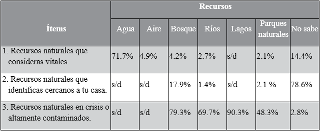 Para identificar los saberes ambientales, en el ítem no. 1 se les pidió enlistar los recursos naturales que consideraban vitales para la subsistencia; en la tabla 1 se observa que para 71.7% el recurso agua es el más importante, le siguió el aire con 4.9%, al respecto, lo que llamó la atención es que 14.4% del estudiantado expresó no saber lo que es un recurso; este resultado coincide con lo investigado por Coya (2001) quién señala la deficiente y escasa formación ambiental que permea entre las nuevas generaciones de jóvenes, situación que los mantienen ajenos a las dimensiones sociales y a las problemáticas ambientales que enfrenta el planeta.