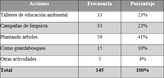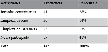 Para identificar los saberes ambientales en función de las responsabilidades compartidas, se les preguntó si anteriormente habían participado en actividades relacionadas al cuidado del ambiente; 28.2% mencionó haber participado en jornadas comunitarias, 13.9% en limpieza de ríos, 17.2% en limpieza de barrancas y 40.7% expresó no haber participado nunca en alguna actividad relacionada al cuidado del ambiente (véase tabla 2).