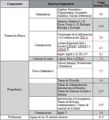 La estructura curricular del BT está conformada por tres bloques: el componente de formación básica, el de formación propedéutica y el de formación profesional, como se señala en el cuadro 1.
