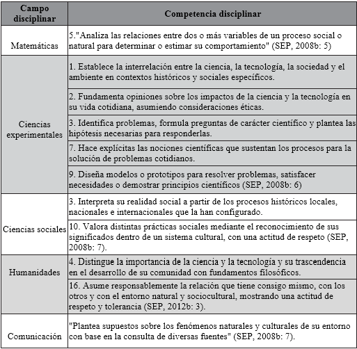 De este concepto central de competencia se derivan las competencias genéricas, disciplinares y profesionales, las que se articulan a través de los programas de estudio de cada asignatura. Las competencias genéricas, 11 en total, tienen como propósito definir el perfil de egreso del estudiante (SEP, 2008b, 2008c). También conforman los ejes transversales al currículum en virtud de su carácter amplio; cada asignatura en función de sus objetivos tomará para sí algunas de ellas integrándolas a su programa de estudios para su desarrollo. Es ahí donde adquiere relevancia la que aborda la EDS. El segundo bloque de competencias corresponde a las disciplinares. Éstas son básicas y extendidas y son propias de cada campo disciplinar, cuyo propósito es que los estudiantes se desenvuelvan y respondan con pertinencia ante las diversas situaciones que se les presentan en contextos variados y momentos a lo largo de su vida (SEP, 2008b).