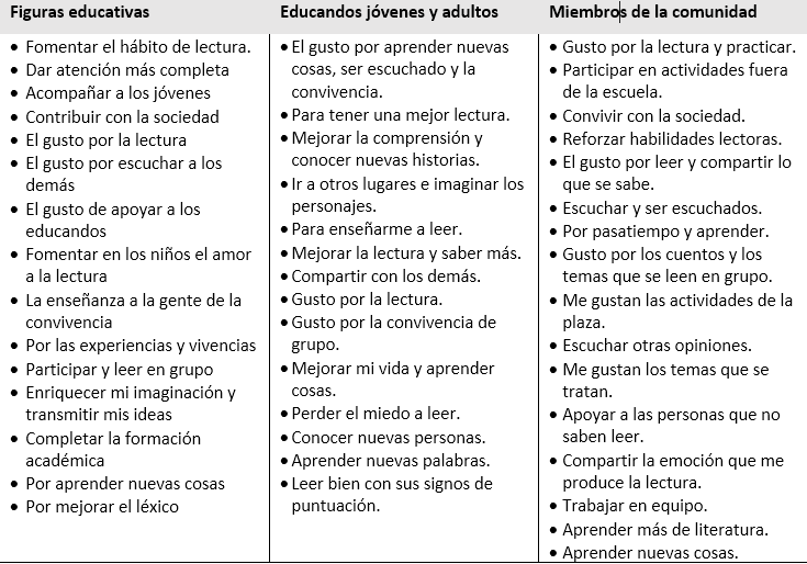 Aprendí —dijo una figura educativa de Puebla— que las personas jóvenes y adultas deben descubrir por sí mismas el placer de leer y escribir; que los círculos de lectura no son bibliotecas donde ir a leer cada individuo en solitario, sino centros de convivencia donde se realizan actividades de lectura y escritura no escolarizadas; que retomar saberes y tradiciones es importante y ayuda a generar el gusto por la escritura.