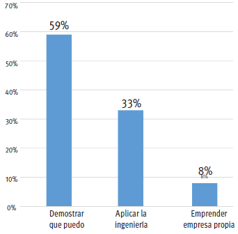Al declarar 58% de las estudiantes que su meta al estudiar ingeniería es demostrar que pueden lograrlo, se evidencia que la mayoría de los alumnos son hombres y las mujeres luchan, en un ambiente adverso, por salir adelante. En estudios relacionados al tema de este ensayo, se encuentra que las mujeres estudiantes de ingeniería frecuentemente se sienten desmotivadas por la fuerte competencia (N. Chesler y M. Chesler, 2002). 33% expresó que su meta es aplicar la ingeniería y hacer proyectos; sólo 8% manifestó que su meta es desarrollarse como un emprendedor y formar su propia empresa.