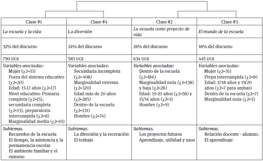 Clase 1: La vida y la escuela. Muestra ser la clase más grande en cantidad de palabras asociadas y de frases significativas, lo que a su vez ha redundado en la generación de subtemas en su interior. Es un discurso más asociado a mujeres y a jóvenes entre 15 a 17 años. También está vinculada a aquellos que en la actualidad están fuera del sistema educativo, cuyo nivel educativo varía desde la primaria completa hasta la preparatoria interrumpida y poseen una marginalidad media.