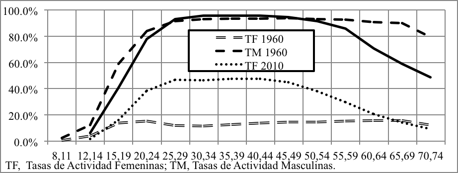 Generalmente la pea se mide en número de personas ocupadas y desocupadas y, rara vez, por la fuerza de trabajo que cada una ofrece como parte de su vida, que bajo un enfoque histórico, conviene revisar. En 1930 la esperanza de vida al nacer era de 36 años (Benítez y Cabrera, 1967, pp. 50-52 ) y en 2014, 78 años (Inegi, 2016); su parte activa fue promovida por el bono demográfico y la inserción femenina en la pea; dicha información se presenta más adelante, en el cuadro 3, que considera el cambio de 1960 a 2010, con los datos que permitieron estimar esos indicadores para el mayor periodo histórico posible, en particular, de las tasas de actividad por sexo y edad (pea de edad x entre la población de edad x) que generalmente se presentan en grupos quinquenales; el grupo inicial fue de 8 - 11 años en 1960 y de 12 -14 años en el 2010; estas tasas de actividad son necesarias para estimar los diversos indicadores de esperanza de vida al nacer (eoo, en el cuadro 3). En México, en el año 1960, se estimó por primera vez la pea en el censo de población, y hubo errores en sus tasas de actividad que El Colmex procuró corregir con una muestra de uno por ciento de la pea, dándoles secuencia lógica (Morelos, 1968, pp. 19-43), y son las aquí adoptadas; las de 2010 se tomaron directamente del Censo de Población. En el gráfico 7, podemos ver esas tasas donde las de edades extremas bajan entre 1960 y 2010 a causa de mejores condiciones de escolaridad de jóvenes y retiro de mayores; las tasas de actividad femeninas crecen en la parte central y desaparece la sima entre las edades de 25 – 29 años vista en 1960, presumiblemente porque las mujeres se retiraban de la actividad laboral al casarse en torno a la edad de veinte y se reintegraban después de transcurrido el tiempo de cuidado de sus hijos en edad pre-escolar.