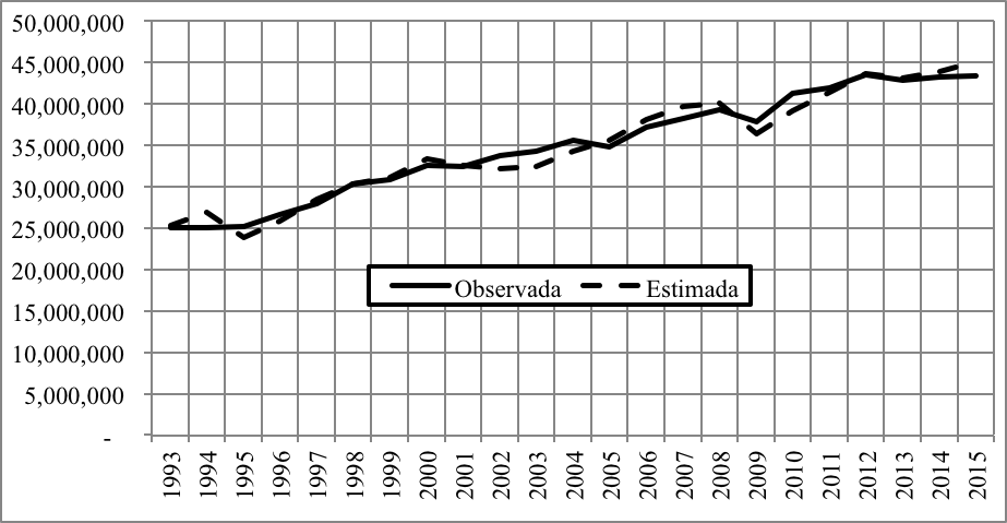 El grado explicativo R2 aj de la ecuación resultante es 0.98, las t de los coeficiente a yb caen en rango de confianza de 95 por ciento (rechazo a su nulidad) y su suma cerca del valor uno especificado teóricamente, también en rango de 95 por ciento; la medición de la auto-correlación con el indicador Durbin Watson (dw) es incierto al 95 por ciento para aceptar la hipótesis de no correlación entre los residuos (entre mínimo 1.17, y máximo 1.54), pero aceptable al 99 por ciento; sin problemas de varianza heterogénea pues la correlación entre residuos y los valores estimados del pib fue nula. Con los estimadores A, ayb se estimó la ocupación con la expresión L=(Q/AKa )1/ b, y el gráfico 10 compara los valores estimados con los observados, presentando un gran acercamiento, es por eso que se usó para pronosticar.