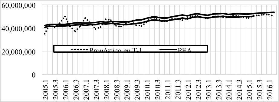 Como resultado de lo anterior, se hizo una proyección de corto plazo con base en la experiencia trimestral de 2005 a 2015 para estimar los dos últimos trimestres de 2015 y los dos primeros de 2016, con los datos de pea que la enoe reporta y el método auto–regresivo Holt Winters multiplicativo que considera la estacionalidad; los resultados se pueden observar en el gráfico 11, donde se advierte que la desocupación persiste y crece en los dos últimos trimestres de 2015 y los dos primeros de 2016, situación realmente preocupante.11