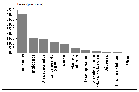 En lo que respecta a la Primera Encuesta Nacional sobre Discriminación, realizada por el Conapred en 2005, se señala que dentro de la diversidad social el grupo que ocupa los primeros lugares en los diferentes tipos de discriminación es el de los adultos mayores, después le sigue la población indígena y los discapacitados (gráfico 5). Las muestras obtenidas en dicha encuesta fueron de un total de 1200 casos diversificadas en los distintos estados de la República Mexicana. Las áreas que fueron contempladas para el primer diagnóstico de la discriminación fueron: por edad, acceso a los servicios de salud, ingresos económicos, espacios físicos o arquitectónicos, obtención de empleo, familia, y servicios públicos. El objetivo de la encuesta fue medir la percepción social sobre el fenómeno discriminatorio.