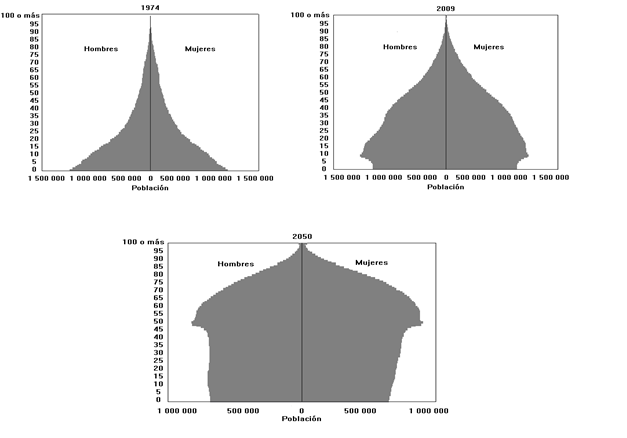 De acuerdo con las proyecciones del Consejo Nacional de Población [Conapo] (2010) al 1 de junio de 2012 la población de 60 años o más era de 10 millones 889 mil 476. Para el 1 de junio de 2013 se calculó en 11 millones 264 mil 358. Para 2015 era de 13 millones 458 mil 229. Entre esas tres fechas hubo un incremento porcentual de 1.7% anual. La tasa de envejecimiento poblacional mexicana, como en cualquier parte del mundo tiene un patrón de crecimiento acelerado (excepto en varios países de África como Ghana, Etiopía, Burundi, Gabón y Botswana, donde la expectativa de vida oscila entre los 35 y 50 años de edad). En México, tan sólo se puede ver la inversión de la pirámide poblacional: si en la década de 1970 el mayor volumen del bono demográfico lo representaba las edades de 5 a 30 años promedio, para 2050 se aprecia dicho volumen oscilará entre los 50 a 70 años de edad. Cabe destacar que las mujeres son las que tienen mayor expectativa de vida (78 años) que los varones (74 años). En el gráfico 1, se puede apreciar el proceso de envejecimiento “moderado” que guarda la población mexicana.