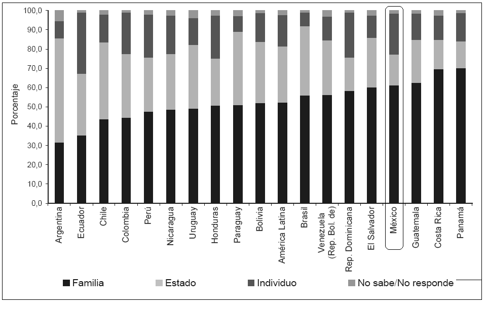 Interpretando la varianza de las respuestas nacionales de la gráfica anterior, se puede decir que en la mayoría de los países latinoamericanos considera que la familia son las responsables de los cuidados y bienestar de sus ancianos (como es el caso de México). Otros consideran (por ejemplo, Argentina) que la obligatoriedad de la atención del adulto mayor le compete principalmente al Estado. Para el caso mexicano pareciera ser que el problema del envejecimiento es una cuestión privada, doméstica (García, 2012). Para Argentina es ante todo un asunto público. Si la interpretación únicamente pondera el espacio familiar y doméstico, entonces se podría inferir que el Estado no tiene ninguna responsabilidad (pública) para velar por la gente anciana. Esa perspectivadeficitaria del Estado con respecto a la vejez puedeabonar, por ende, en su irresponsabilidad social.