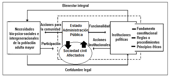 Se llega a una política pública cuando se ha desarrollado un proceso de madurez, sensibilización y de responsabilidades de los actores políticos institucionales (García, 2006b) por las necesidades humanas o de los ciudadanos que aspiran al legítimo derechos de vivir dignamente. El cuadro 3, indica cuatro cosas: 1) el proceso de articulación entre las demandas encuadradas en el ámbito de la satisfacción de las necesidades biopsicosociales e intergeneracionales de las personas de edad avanzada; 2) la importancia de los mecanismos de participación pública de los interesados; 3) la reconfiguración de las instituciones al servicio de las exigencias sociales (bajo un marco ético-normativo donde las decisiones de los actores políticos tienen que ser funcionales, equitativas, justas y de largo plazo); y, 4) maximizar el bienestar no solamente de la población longeva sino de toda la comunidad independientemente de la edad, el género, la raza, conocimientos profesionales, residencia.