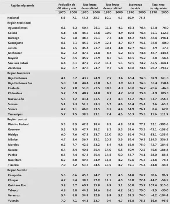 El proceso del envejecimiento mexicano es heterogéneo: en cuanto a edades, situación socioeconómica, procedencia étnica, residencia, calidad de vida, nivel educacional, entre otros. Un dato que vale la pena reflexionar es la problemática migratoria, la cual se ha hecho notar en las zonas rurales. Las causales del proceso migratorio relacionado con la tasa de envejecimiento han sido el éxodo a los Estados Unidos y algunas ciudades de la República Mexicana, de la población joven y adulta (en edad productiva), y el declive de la agricultura como principal elemento generador de riqueza. Eso ha causado un cambio en la composición familiar, en las relaciones comunitarias, en la distribución de las responsabilidades intrafamiliares, en los usos y costumbres de la población y en las diversas formas de organización política en los municipios que muchas veces no saben cómo interpretar dicha problemática. En el cuadro 1 se percibe el alarmante déficit de la población activa en las regiones de país.