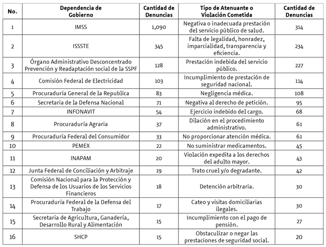 En materia de derechos humanos, aunque ha habido avances institucionales por parte de la Comisión Nacional de Derechos Humanos [cndh], órgano rector del gobierno federal, sin embargo han sido insuficientes. Quizás porque la función de la cndh es más de tipo procedimental, de fiscalización y de orientación, que de regulación e intervención en el sentido fuerte y estricto. Es decir, aunque se reconoce la preocupante desprotección institucional hacia adultos mayores (cuadro 2), sin embargo, quedan esos aspectos pendientes de ser resueltos o de coadyuvar a resolverlos.