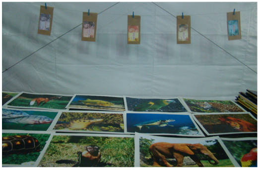 El desarrollo de la actividad se inició invitando a las personas a acercarse a ver un video corto con duración de un minuto y medio, sobre los animales ( https://youtu.be/EFH0B_LSeT4 ). La curiosidad del público era estimulada, una vez que el video era exhibido dentro de una grande caja negra de cartón, que funcionaba como una cabina oscura. En el interior de esta caja, había un computador portátil que mostraba las imágenes de 20 animales,3 de los cuales 16 eran brasileños y 4 eran exóticos. Después de observar el video, el participante era invitado a relacionar los animales vistos con los animales de las imágenes de los billetes del Real que estaban colgados en una cuerda como un tendedero. Las reproducciones ampliadas de los billetes de R$2; R$5; R$10; R$20; R$50 y R$100, fueron expuestas dentro de sobres que cubrían los animales y dejaban expuestos sus valores monetarios. Encima de una mesa, había tarjetas con la imagen de los mismos 20 animales del video para ayudar a las personas en sus elecciones. Al participante se le pidió escoger entre las tarjetas aquella que contenía el animal que estaba impreso en cada billete del tendedero. Así como el video, las tarjetas con muestras de animales fueron una estrategia para incentivar la participación pública y facilitar la tarea de recuperar la memoria visual de los billetes que son parte de la rutina del brasileño (véase imagen 1).
