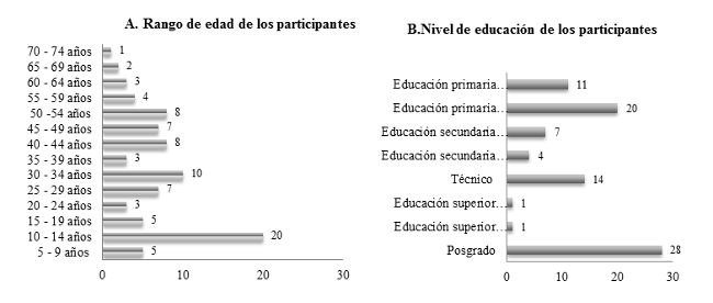 Los datos obtenidos a partir del cuestionario, de los participantes que estaban solos, registran que de las 86 personas que formaron parte de la actividad “Animales Notables”, 30 eran mujeres (35%) y 56 eran hombres (65%). La mayoría, 74 personas (86%) eran residentes de Campinas. El rango de edad fue variado, pero presentó mayor concentración de niños y adolescentes (de 10 a 14 años), seguida de adultos (de 30 a 34 años). El nivel educativo de los participantes también contempló los diferentes niveles de enseñanza, predominando la educación primaria incompleta, lo que es entendible, debido a la participación del público infantil y juvenil en edad escolar que visitó la snct como parte de sus actividades escolares (ver Gráfica 1).