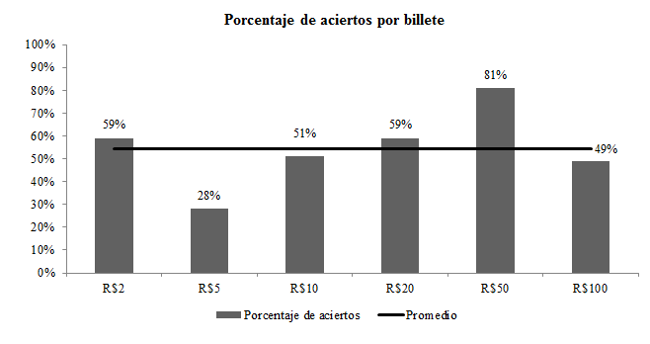 El promedio general de aciertos fue de 55%. Es posible observar que la relación animal-billete más recordada por los participantes fue la del jaguar, R$50 , seguida por los billetes de R$2 (tortuga marina) y de R$20 (mico-tití-dorado). Se evidenció que los billetes con menor proporción de aciertos fueron el de R$5 (garza blanca), seguido por el de R$100 (el mero), tal y como se observa en la gráfica 2.