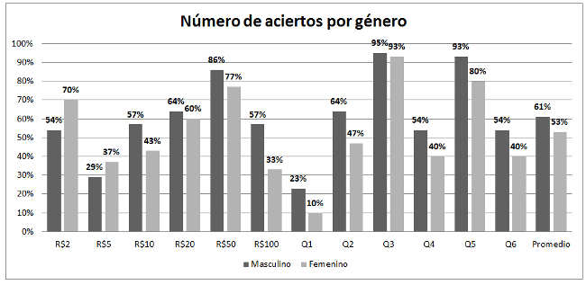 El primer ítem analizado es el de género. En la gráfica 3, es posible observar que los hombres mantienen en casi todas las cuestiones (excepto sobre los animales en el billete de R$2 y R$5) un mayor porcentaje de aciertos. En promedio, el género masculino mantuvo un mayor porcentaje de aciertos (61%) en comparación con las mujeres (53%).