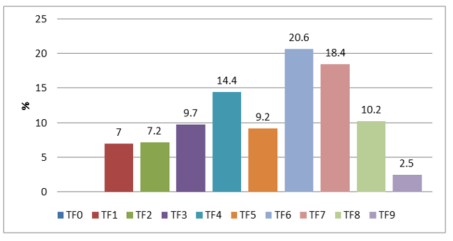 Respecto a las condiciones bucales, se observó que la prevalencia de fluorosis fue del 93%, y como se puede observar en la gráfica 1, más de la mitad de la población estudiada (51.7%) presenta fluorosis TF>- 6. El otro 45% de la población, no ha tenido experiencia de caries. La media del cpod fue de 1.8 (±2.5), Cariados 1.4 (±2.0), Perdidos 0.03(±0.2) y Obturados 0.42(±1.4).