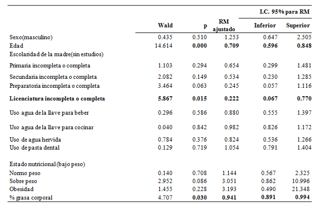 Asimismo, en el segundo modelo de regresión logística, en el cual la variable dependiente fue TF<6 vs TF≥6, se observó que existen variables asociadas estadísticamente significativas, como la edad (RM 0.705, p<0.001), la escolaridad de la madre (RM 0.842, p=0.007) y el porcentaje de grasa corporal (RM 0.914, p=0.013), los cuales resultan factores benefactores para evitar la presencia de fluorosis dental grave (Tabla 5). Es decir, los sujetos cuyas madres tienen estudios de licenciatura, mostraron menor riesgo (RM=0.22 p=0.015) de presentar fluorosis dental grave, en comparación con los individuos cuyas madres tienen un nivel de estudios inferior. Del mismo modo, el modelo indica que por cada aumento porcentual en la grasa corporal, existen 6% menos probabilidades de presentar fluorosis dental TF≥6.