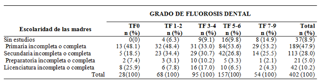 Se evaluó también la existencia de la asociación entre la gravedad de fluorosis dental y la escolaridad de las madres. Se observó que de los individuos que presentaban fluorosis TF5-6 y TF7-9 el 90.2% y el 93.6% de las madres, respectivamente, tenía como máximo nivel de estudios la secundaria (Tabla 1); esta asociación fue estadísticamente significativa (Chi= 34.24, p=0.005).
