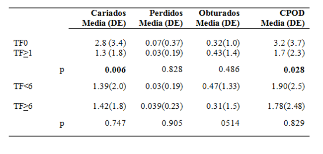 Posteriormente, para evaluar la asociación de caries con la presencia de fluorosis dental, se dividió a la población en dos grupos, aquellos sin fluorosis (TF0) y aquellos que presentaban algún grado de fluorosis (TF≥1), posteriormente, se compararon la medias del cpod de cada uno de estos grupos. Se observó que los niños que no presentan fluorosis tienen una media de cpod y de dientes cariados mayor comparada con la obtenida en aquellos que tienen algún grado de fluorosis, estas diferencias son estadísticamente significativas conforme a la prueba de U de Mann-Whitney. Sin embargo, no se observaron diferencias en los promedios de los otros componentes del cpod. De la misma forma al comparar aquellos sujetos con fluorosis grave (TF≥6) (31.8% de los casos), no se observaron diferencias estadísticamente significativas en el cpod o en alguno de sus componentes (Tabla 2).