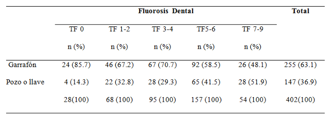 Por otro lado, existió diferencia estadísticamente significativa (Chi=10.07, p=0.039) con respecto al tipo de agua consumida y la gravedad de fd . Se observó que el 85.7% de aquellos libres de fluorosis dental consumen agua de garrafón (Tabla 3). De igual manera, aquellos que presentan TF1-2 o TF3-4 pertenecen al porcentaje de personas que consume agua de garrafón y es claramente más elevado: cercano al 70%.