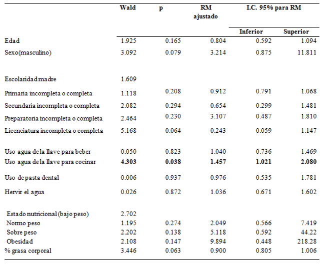 Por otro lado, en el análisis multivariado, se observa que el uso de agua de la llave para cocinar es un factor de riesgo, por ello, sería importante realizar campañas informativas dirigidas a las madres, para que conozcan los riesgos que esta práctica conlleva, con el fin de evitarla. La prevalencia de caries y el promedio de cpod observado en esta población son más bajos que los reportados anteriormente en los habitantes de Guanajuato, esto, conforme a los datos obtenidos en la Encuesta Nacional de caries y fluorosis 2001, en la que se reportó una prevalencia de caries de un 63.3% en escolares de 12 años, (sinave/dge/salud , 2010), mientras que en la población objeto de este estudio, fue del 55%. Así mismo el cpod en dicha encuesta fue de 2.5 y en nuestra población fue de 1.8. Esto es congruente con los estudios que reportan una tendencia hacia la reducción de la prevalencia de caries en nuestro país. (Irigoyen & Sánchez-Hinojosa, 2000) O bien, esta diferencia puede radicar en la zona donde se realizó el estudio, en donde la fluorosis dental es endémica y existen diversos estudios realizados en niños de 12 años, en los cuales se ha confirmado una menor prevalencia de caries con un cpod menor que en aquellas zonas donde hay una mayor prevalencia de fluorosis (Angelillo et al. , 1990).