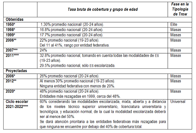 Como puede observarse en la tabla 1, tanto la prospectiva de cobertura del año 2006 (22%) como al 2020, mantienen al ses en el nivel de masificación (Trow, 1973). Sin embargo, la anuies (2012), para el ciclo escolar 2021-2022, estableció que el objetivo de cobertura sea de un 60%. Con ello la es en México pasaría de la fase de masificación, a la de universalización.