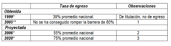 Bajo ese esquema, se estableció como meta para el año 2020, que la cantidad de alumnos que alcanzará la titulación en los niveles técnico superior y licenciatura llegará al 75% (tabla 2), especificando que, el lapso de tiempo para la titulación, en promedio, será del 20% de la duración oficial del plan de estudios respectivo.
