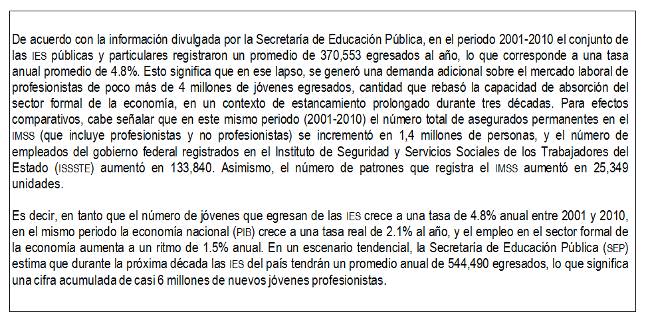 La situación brevemente descrita sería la siguiente: al egresar de los es, se pasa de ser demandante de estudios a demandante de un puesto de trabajo calificado en el mercado laboral de profesionistas. Dadas las políticas de cobertura y eficiencia terminal, cada ciclo escolar, la demanda es mayor, y ésta se adiciona a la existente, generándose una demanda acumulada creciente.