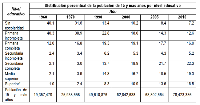 Datos del inegi evidencian que México ha avanzado en su objetivo de incrementar el nivel de escolaridad de sus habitantes (tabla 3); en específico, a nivel superior, los habitantes con algún grado concluido, han pasado de representar el 8.3% en 1990 a un 16.5% en 2010; esto es, de 4.117,702 personas a 12.939,850.