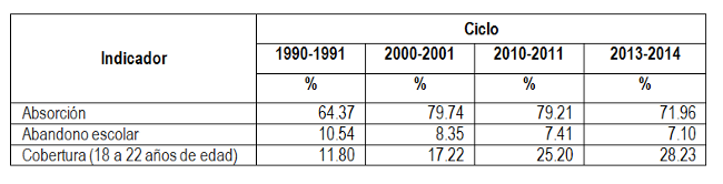 En buena medida se han obtenido esos resultados por la mejora consistente en los indicadores de absorción, permanencia escolar y cobertura. Siendo este último el que mejor desempeño presenta, al casi triplicarse entre la población de 18 a 22 años, entre 1991 a 2014 (tabla 2).