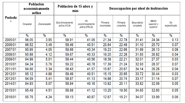 Los datos de empleo y desocupación en México dan cuenta de varios hechos (tabla 5). Para empezar, del total de población desocupada, las personas con primaria incompleta y primaria terminada tienen el porcentaje más bajo para 2016, con una disminución consistente desde el 2005.