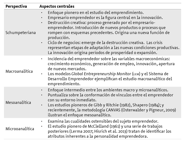 Dada la complejidad inherente a la definición de emprendimiento,1 es inexistente un punto de vista único y generalizable. Por tanto, se plantea la identificación de cuatro vertientes que abordan esta temática desde ángulos divergentes, aunque complementarios: visión schumpeteriana, entorno macro, ámbito meso y contexto microanalítico.