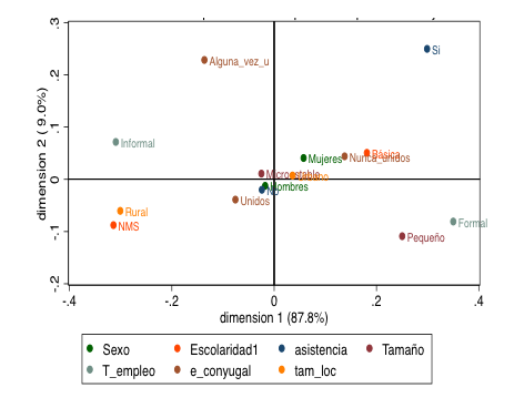 La inclusión del Análisis de Correspondencias Múltiples ( acm ) tiene como finalidad, brindar un panorama gráfico del contexto emprendedor. Se trata de un método caracterizado por asociar valores de diversas variables con diferentes categorías, siendo agrupados contiguamente casos u objetos con peculiaridades similares y alejados de éstos aquellos con características divergentes (Abad, Muñiz y Cervantes, 2003).