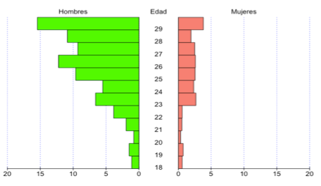 En relación a la edad y el sexo de los jóvenes que deciden emprender, se visualiza una mayor participación de los hombres para todos los segmentos de edad respecto a las mujeres. Asimismo, se percibe una relación positiva entre la edad y la orientación hacia el emprendimiento, circunstancia vista principalmente en hombres, debido a que conforme aumenta la edad se incrementa el interés por desarrollar alguna labor económica de forma independiente. Para el género femenino, se observan tres comportamientos distintos: el primero, abarca de los 18 a 22 años con escasa participación en el emprendimiento; el segundo, de los 23 a 28 años que ostentan una mayor presencia en la actividad emprendedora y, el tercero, a los 29 años, edad en la cual las mujeres se interesan significativamente en la creación de negocios (gráfica 3).