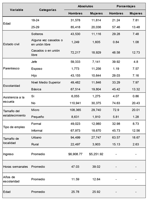 Los aspectos individuales, materializados por la edad, sexo y estado civil, permiten examinar las características sociodemográficas de los emprendedores. El contexto educativo representado por la asistencia a recibir instrucción educativa5 y el nivel de escolaridad, posibilitan observar el grado de especialización de los jóvenes emprendedores. Las características del negocio, simbolizados por la clase de empleo creado y el tamaño de los establecimientos, permiten visualizar las condiciones favorables o desfavorables del emprendimiento. Finalmente, el entorno espacial hace referencia al tipo de localidad donde se inserta el nuevo negocio.