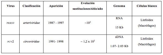 El PRRSV y el PCV2 son dos patógenos presentes en la enfermedad respiratoria porcina. Está bien documentada la interacción entre ellos, de hecho, es frecuente su coexistencia y esto favorece las infecciones bacterianas (Cao et al ., 2016). Resulta interesante saber que el surgimiento de estos virus, es muy cercano uno del otro y, que ambos pueden coexistir en las mismas células diana, es decir, ambos se replican eficientemente en células del sistema inmune, particularmente macrófagos. En la tabla 1, se contrastan algunos datos generales de estos virus.