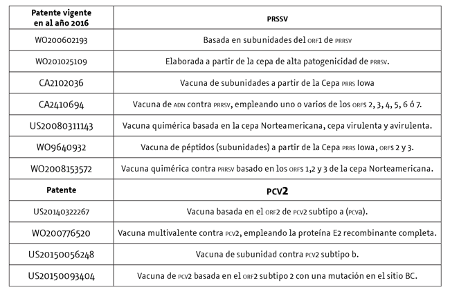En la tabla 2, se incluye información de vacunas de nueva generación patentadas para PRRSV y PCV2 donde se emplean subunidades de los virus. Algunos datos interesantes de la generación de vacunas contra serotipos específicos son: la selectividad contra ese serotipo o variante; la generación de vacunas basadas en antígenos esenciales universales, las cuales han resultado en candidatos a vacuna con buenas expectativas. En este último caso, se considera la utilización de los fragmentos genómicos responsables de la patogenicidad y la inmunidad, sugiriendo una mayor capacidad protectora. Otro aspecto importante es la evaluación de la respuesta inmune fuerte y sostenida, considerando los cambios del virus a través de sus ciclos de replicación.