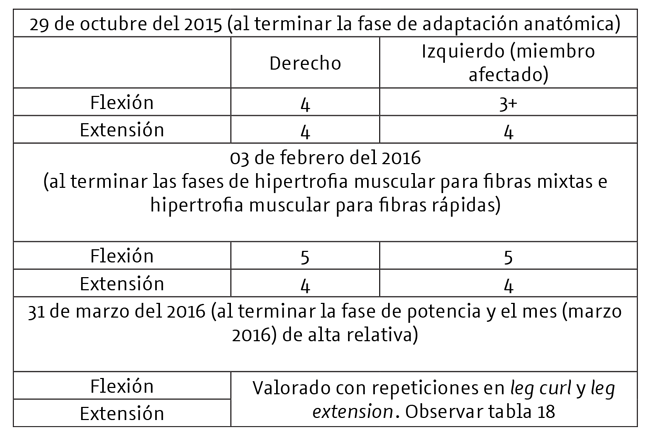 El examen clínico muscular para fuerza, evaluado por medio de resistencia manual, empleando la escala Daniels - Worthingham, con valores de 0 a 5 (Hislop, Avers y Brown, 2014), arrojó en isquiotibiales: derecho 4 e izquierdo 3+ y valores en 4 para cuádriceps. Al finalizar la fase de potencia, los valores para isquiotibiales fueron iguales en 5 y para cuádriceps iguales en 4. (Ver cuadro 3).