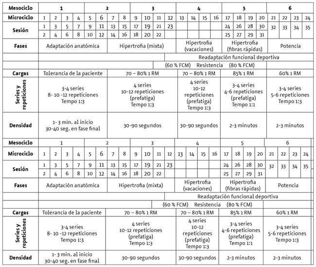 De la semana 1 a la semana 6 se trabajó la fase de adaptación anatómica; de la semana 7 a la semana 12 se trabajó la fase de hipertrofia para fibras mixtas; de la semana 13 a la semana 16 correspondió al ciclo vacacional de la clínica de fisioterapia de la enes que abarcó el mes de diciembre de 2015, en dicho periodo se le dejó a la paciente trabajo de hipertrofia para fibras mixtas en un gimnasio particular; de la semana 17 a la semana 20 correspondió a la fase de hipertrofia para fibras rápidas; finalmente de la semana 21 a la semana 24 transcurrió la fase de potencia. Cabe destacar, que al mismo tiempo que se llevaron a cabo las fases ya mencionadas, también se trabajaron las fases de resistencia aeróbica y readaptación funcional deportiva, de la semana 13 a la semana 20 y de la semana 20 a la semana 24 respectivamente. También se estipuló la carga de trabajo, las series y repeticiones, el tiempo del movimiento concéntrico y excéntrico, así como la densidad (Bompa, 2015).