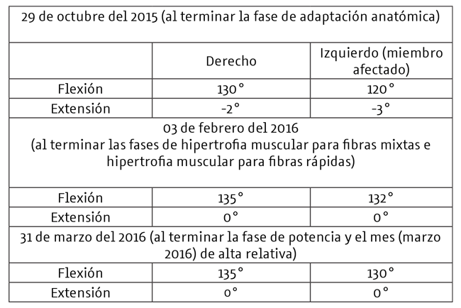 Los arcos de movimiento de la rodilla evaluados por medio de goniometría, de acuerdo a lo descrito por Kapandji (2006) y Taboadela (2007), al término de la fase de adaptación anatómica, arrojaron una diferencia de 10 grados entre el miembro sano y el afectado en cuanto a la flexión, en cuanto a la extensión, ninguna de las dos piernas obtiene cero grados y existe un grado de diferencia entre ambas. Al finalizar la fase de hipertrofia, la diferencia en flexión fue de cinco grados y en la extensión se encontraron valores iguales a cero grados en ambas rodillas, mientras que, al finalizar la fase de potencia, los valores en flexión fueron menores en cinco grados en el miembro afectado y en la extensión permanecieron en valores iguales. (Ver cuadro 2).