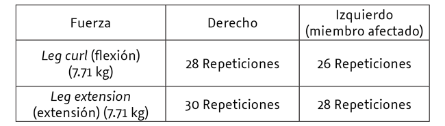 Al finalizar la fase de potencia se realizó una valoración de la fuerza en relación con las repeticiones realizadas en los aparatos de leg extension y leg curl entre ambos miembros. Se obtuvo una diferencia de 2 repeticiones en leg curl entre el miembro sano y el afectado (28 vs. 26) y en leg extension también 2 repeticiones (30 vs. 28). (Ver cuadro 4).
