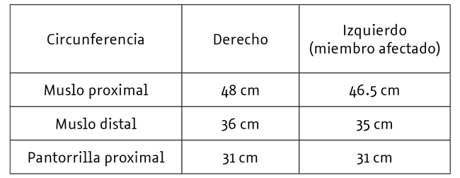 La medición de circunferencia arrojó diferencias en el miembro afectado de: 1.5 cm en muslo proximal, 1 cm en muslo distal, mientras que, se mantuvieron iguales en pantorrilla. (Ver cuadro 5).